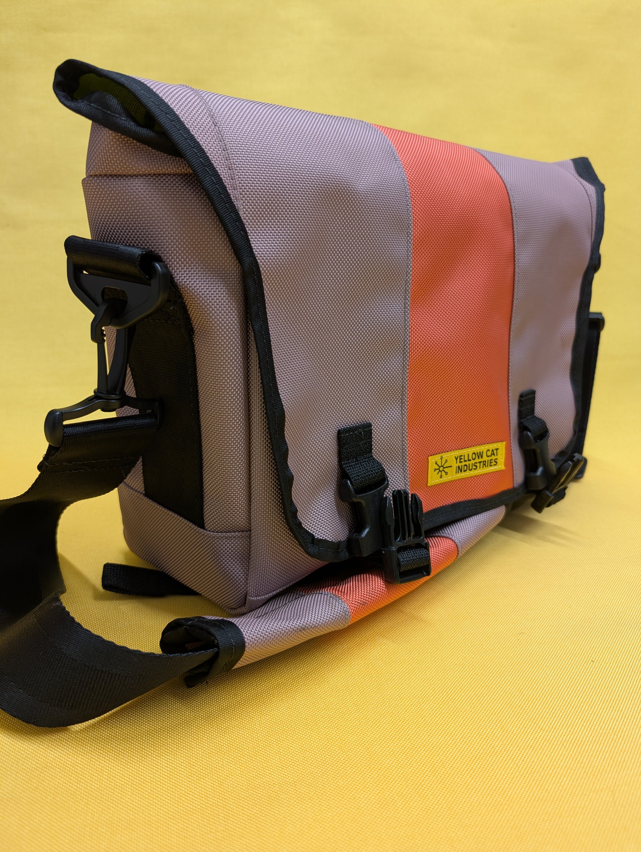Tough ballistic nylon exterior, fully lined interior with 2 dividers. Padded back where it comes into contact with body. 2 inch seatbelt webbing shoulder strap with a matching padded shoulder pad. Oh, and a handy small zippered pocket for keys and random bits on the front of the bag!